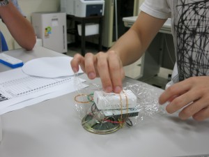 プログラミングは前日に済ましていたので,スピーカー,モバイルバッテリーを接続してラップで巻いています.